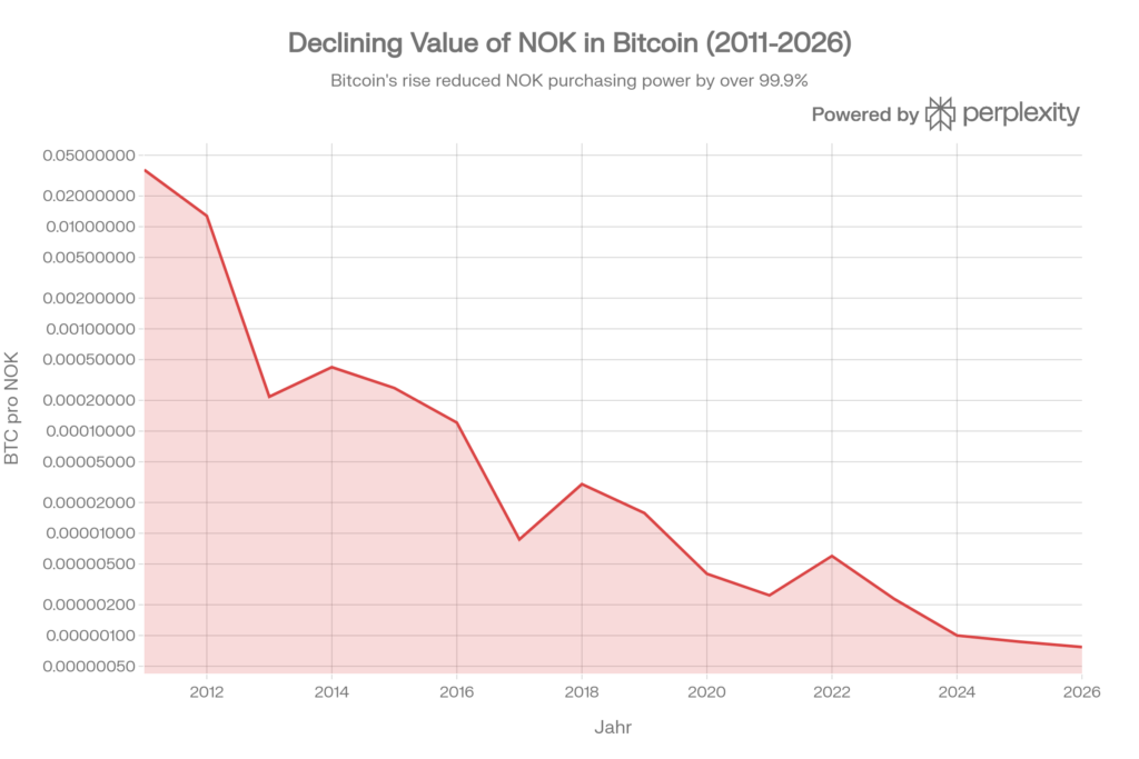 -Genau so ist es. Die Krone von einer Währung, die in „ganzen Bitcoins“ gemessen wurde (2011), zu einer Währung, die heute nur noch Bruchteile eines US-Cents in BTC wert ist, mal logarithmisch dargestellt. Euro war da nicht viel besser, aber viel stärker als NOK.