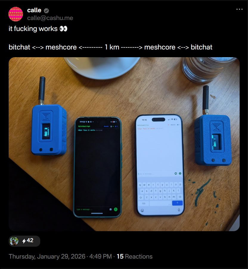 Parallel dazu treibt das Projekt BitcoinLoRa-MeshGateway (v3.2.0) die finanzielle Souveränität voran. Es ermöglicht das Senden von Bitcoin-Transaktionen in Gebieten ohne Internetzugang, indem es signierte Rohdaten in kleine Pakete fragmentiert und über das Meshtastic-Netzwerk überträgt. Ein entferntes Gateway mit Internetverbindung speist diese in die unzensierbare Timechain ein.